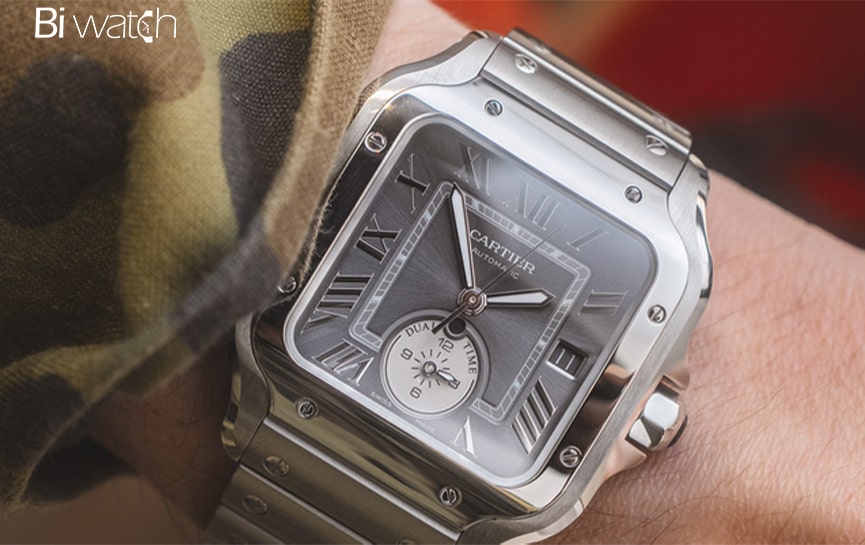 Cartier Dual Time جدید نیز کمی بزرگتر از مدل بزرگ استاندارد سانتوس با عرض 40.2 میلی متر و ضخامت 10.1 میلی متر است. برای مقایسه، مدل بزرگ 39.8 میلی متر عرض و 9.38 میلی متر ضخامت دارد.